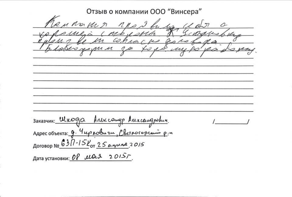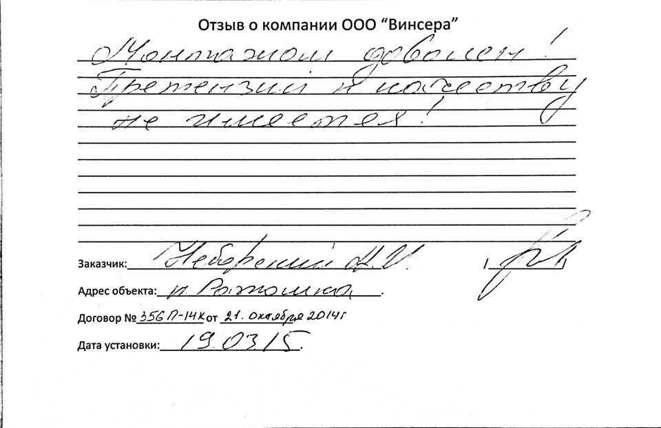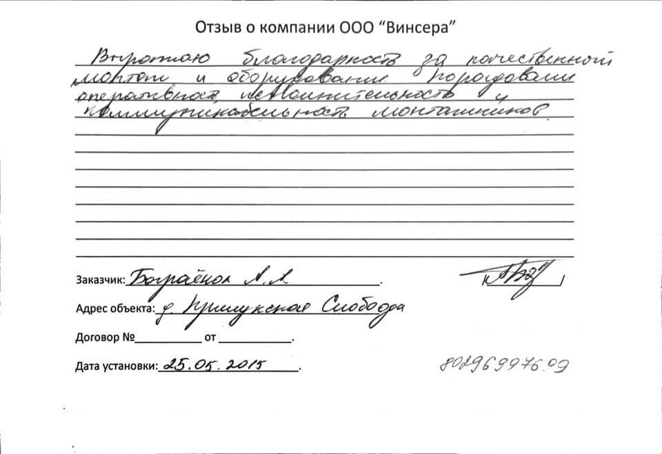 Выражаю благодарность за качественный монтаж и оборудование. Порадовали оперативность, исполнительность и коммуникабельность монтажников.