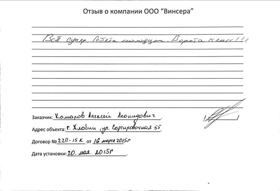 Хочу поблагодарить ребят, которые с высоким профессионализмом выполнили работы по монтажу откатных ворот. Отдельная благодарность Андрею, менеджеру, за терпение и быстрые решения возникающих вопросов.