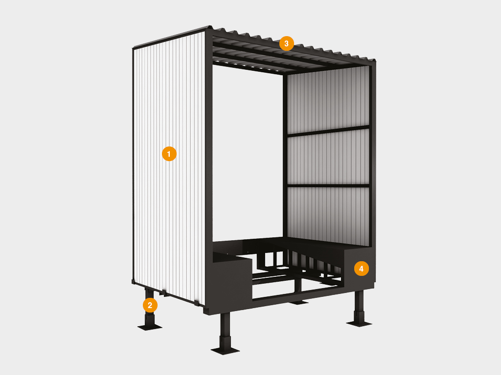 Исполнение стен — из профлиста С20. 4 стандартных цвета: RAL 9003 (белый), RAL 5005 (синий), RAL 7004 (серый), RAL 3000 (красный)